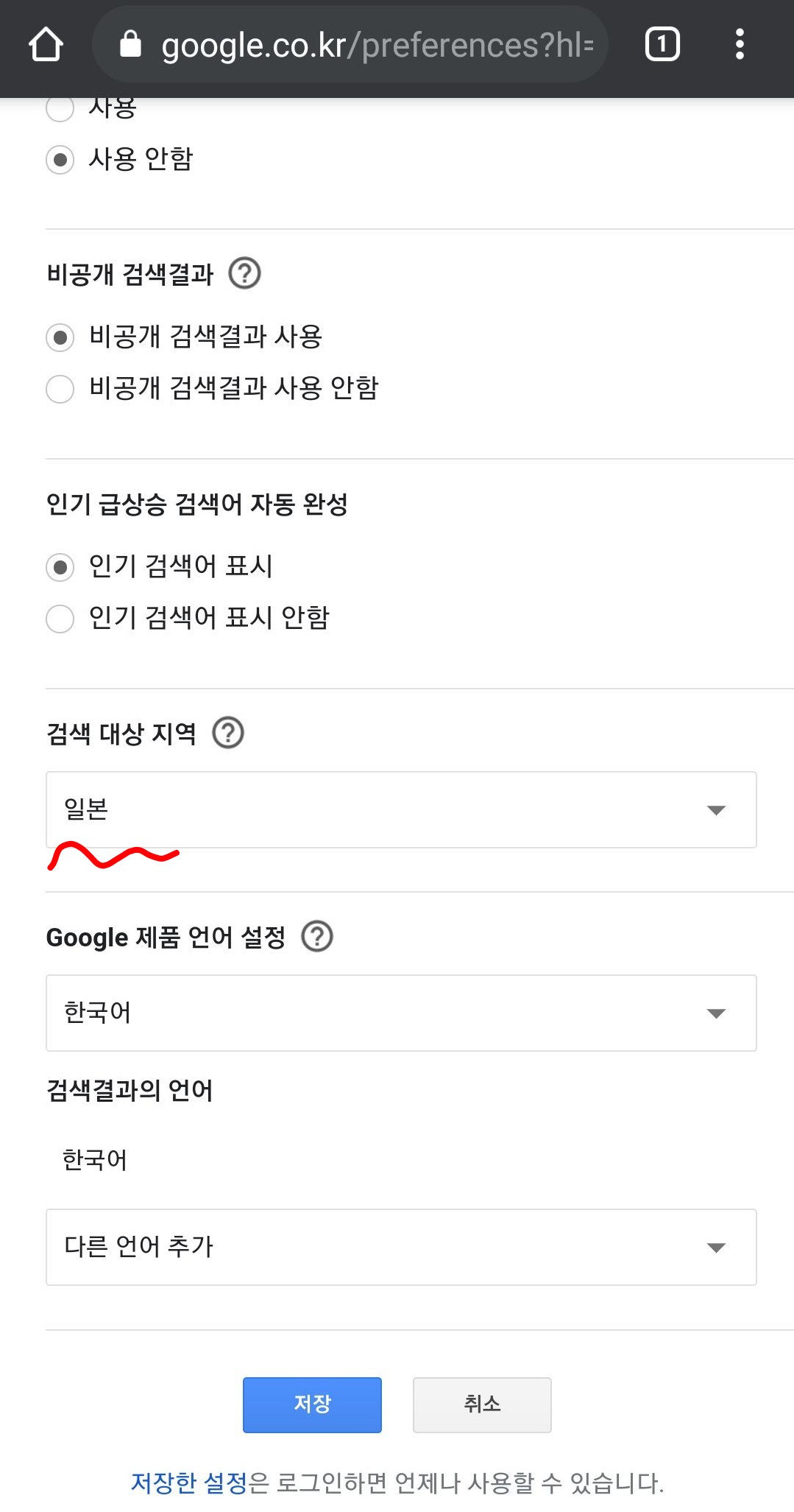 7. 검색 대상지역 일본, Google 제품 언어 설정 일본어로 바뀐 게 확인이 되셨으면 맨 아래 저장을 클릭하시면 됩니다.